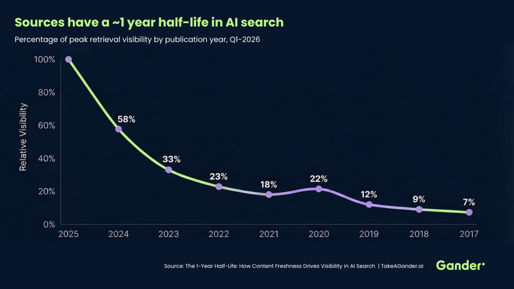 - Content has a 1-year half-life in AI search. Each year of age reduces a page’s visibility by roughly 40-60%. Two-year-old content operates at 33% of current visibility. Three-year-old content is below 25%.